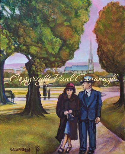 Nostalgic image of a couple strolling in Brooke Park, Derry c 1930s.